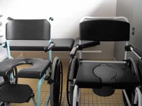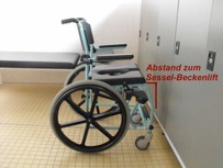 Anm.: BMIN-Red.: Es gibt zwei Duschrollstühle. Mit einem Duschrollstuhl kann man jedoch nur schwer zum Sessel-Beckenlift in die Schwimmhalle gelangen, da dieser zwar „wasserfest“, jedoch nicht für größere Strecken geeignet ist.