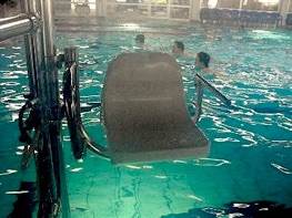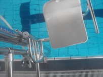 Anm. BMIN-Red.: Ein Sessel-Beckenlift (Einstiegshilfe) ist ein Plastikstuhl mit dem mobilitätseingeschränkte Personen per Hydraulik ins Wasser gelangen.