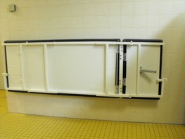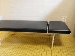 Behinderte Mitbürger brauchen oft eine Liege um sich umziehen zu können. Da meistens Platzmangel in den Umkleideräumlichkeiten, speziell für Menschen mit Behinderung herrscht, wurde dies im Brigittenauer Hallenbad gut gelöst, da die Liege an der Wand zum Herunterklappen montiert wurde.