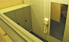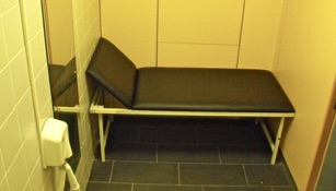 Behinderte Mitbürger brauchen oft eine Liege um sich umziehen zu können. Die Umkleidekabine im Ottakringer Hallenbad ist zwar sehr klein, jedoch mit einer gepolsterten Liege ausgestattet.