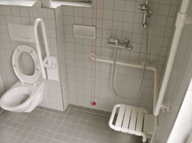 Anm.: BMIN-Red.: Es gibt zwei Duschrollstühle (man verwendet solch ähnliche Rollstühle auch in Pflegeheimen um die Notdurft verrichten zu können). Mit so einem Rollstuhl kann man jedoch nur schwer zum Sessel-Beckenlift in die Schwimmhalle gelangen, da dieser zwar „wasserfest“, jedoch nicht für größere Strecken geeignet ist. Außerdem ist der Spalt zwischen Duschrollstuhl und des Sessel-Beckenliftes relativ groß (Unfallgefahr). Mit dem Straßenrollstuhl ist es untersagt in die Schwimmhalle zu fahren.