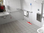 Hallenbad: Ein WC, eine Brause, sechs Kästchen, ein Treppenlifter (Schrägaufzug) zum Restaurant, zwei Dusch-Rollstühle, ein Sessel-Beckenlift, ein Parkplatz - (nicht leicht erkennbar, da dieser nicht beschriftet ist). (Siehe Fotos)