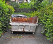Die beiden Fotos unten links: Ein Müllcontainer - hier könnte zumindest ein öffentlicher Behindertenparkplatz eingerichtet werden - eine „versteckte“ Halteverbotstafel mit dem Hinweis: Ausgenommen Menschen mit Behinderung/Rollstuhlsymbol.